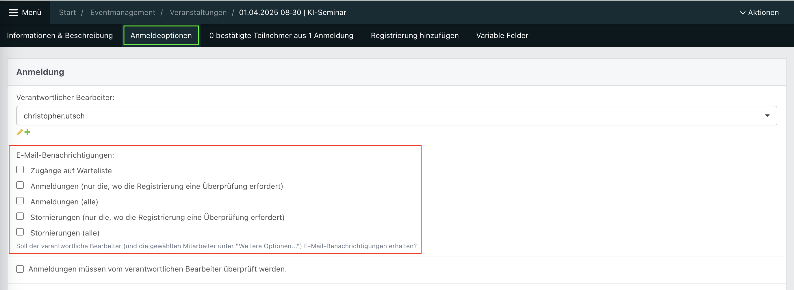 Eine Checkbox, um alle E-Mail-Benachrichtigungen an den Eventverantwortlichen zu senden.
