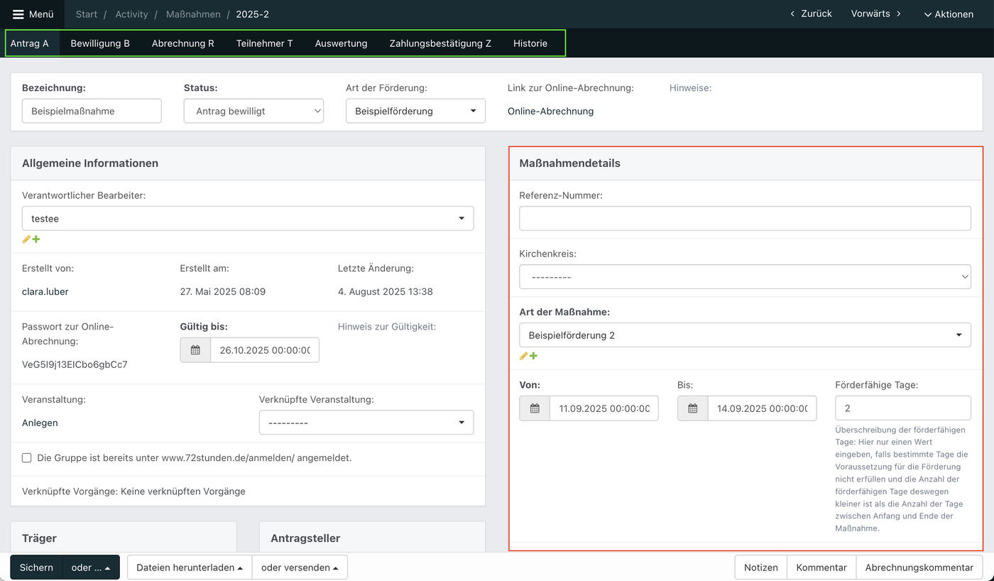 Hier siehst und bearbeitest du Titel, Status und Förderart der Maßnahme. Den Antragsstatus kannst du direkt anpassen.